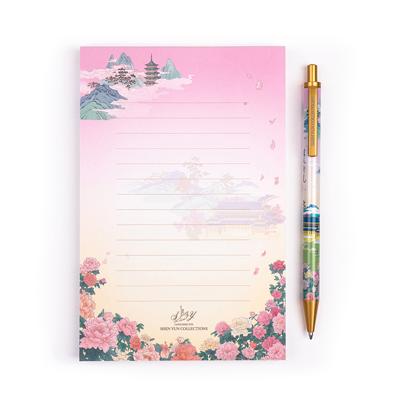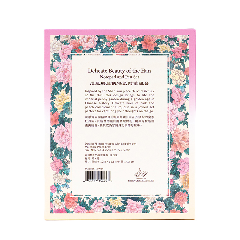 靈感源自神韻節目《漢風綺麗》中花卉繽紛的皇家牡丹園,此組合的設計將精緻的粉、桃與綠松色調柔美結合,願其成為您隨身記事的好幫手。