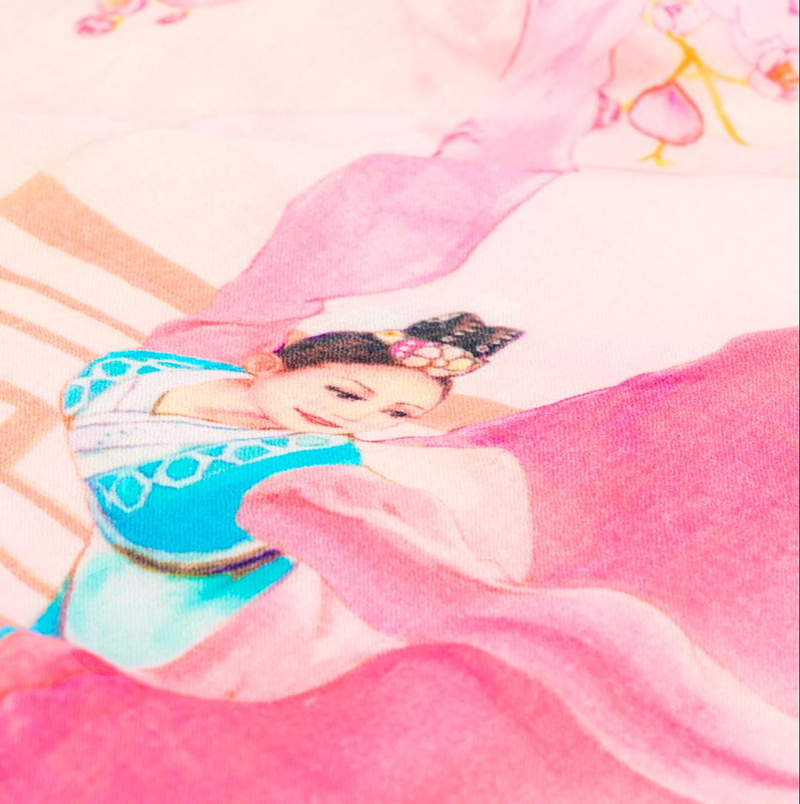 Inspired by the Shen Yun dance Courtyard Elegance as well as various water-sleeves dances seen in Shen Yun performances, this captivating scarf design takes you to a tranquil garden that breathtakingly extends from the shimmering koi pond to the towering mountain peaks and beyond. There, a maiden is seen gracing the scenery with her sleeves dancing in the air and a gentle smile on her face. With light gliding steps, she moves like the delicate petals of spring blossoms, while her long, flowing sleeves express the serene ease of a heart unbounded by the mundane world.