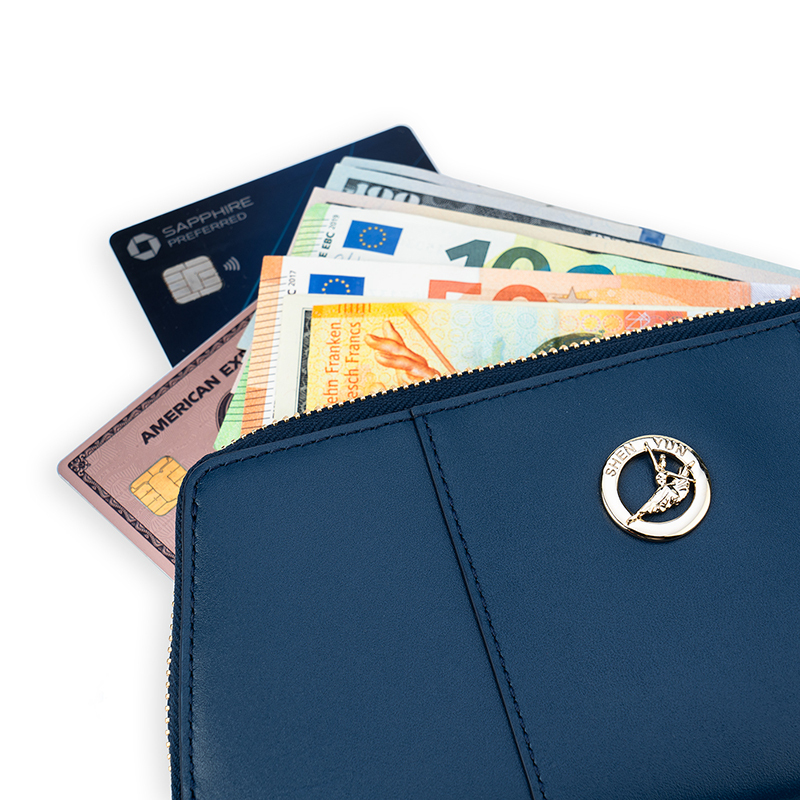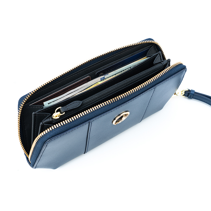 Interior: 12 card slots, 1 zippered coin pocket, 3 bill compartments, 2 slip pockets