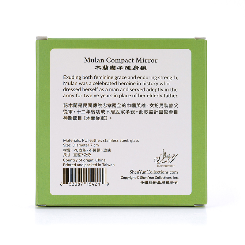 花木蘭是民間傳說忠孝兩全的巾幗英雄,女扮男裝替父從軍,十二年後功成不居返家孝親。此款設計靈感源自神韻節目《木蘭從軍》。
