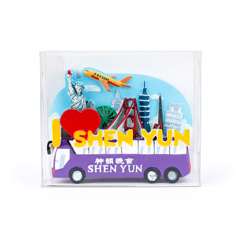 神韻藝術團亮麗醒目的巡迴巴士總馬不停蹄的穿梭於各巡演城市間, 協助藝術家們將中華五千年神傳文化蘊含的純善、純美傳統藝術展現於世界的舞台。此款精美的立體磁鐵將繽紛多彩的神韻巴士融入設計, 願為您的生活帶來新啟發。