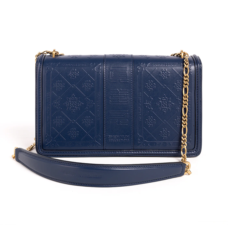 為紀念神韻舞蹈作品中所傳達 的普世價值觀──真、善、忍, 此款由義大利高品質皮革製成,精心處理的小箱包採用了中西合璧的設計理念,以中華具有「吉祥」寓意的寶相花紋與西方具有「永恆」象徵的莨苕葉紋結合襯映優雅的字樣來表達屬 於全人類的非凡價值觀。俐落的線條感搭配柔美紋飾,既時尚又優雅,願「真、善、忍」肩背小箱包開創您的時尚風采。