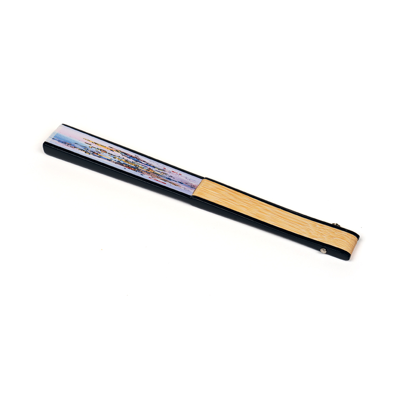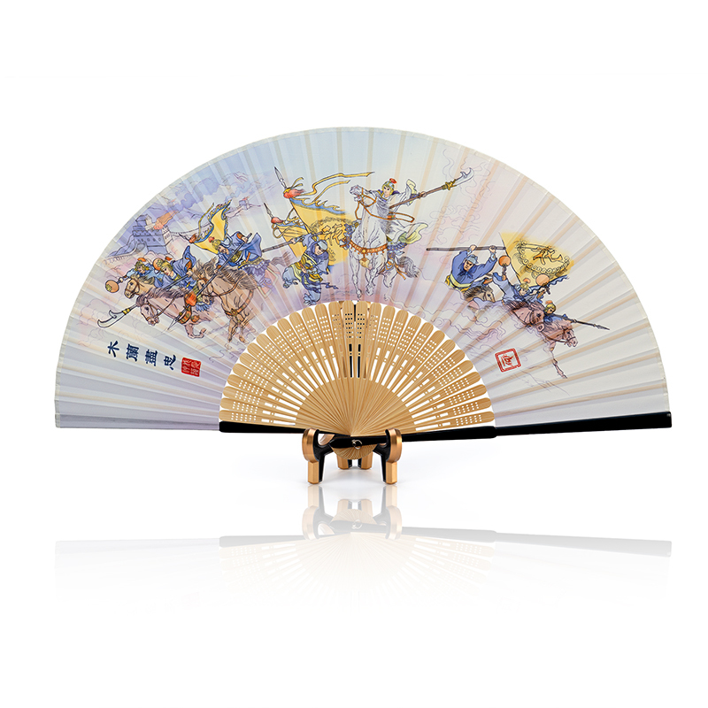 Mulan Joins the Battle Fan 花木蘭是民間傳說忠孝兩全的巾幗英雄。北魏遷都洛陽後受北方遊牧民族侵犯,朝廷徵召每戶一名男子上戰場,木蘭考量父親年紀已大,弟弟尚幼,於是女扮男裝替父從軍,十二年後功成不居返家孝親。此摺扇的設計靈感源自神韻節目《木蘭從軍》,將木蘭代父盡忠於戰場上英勇領兵直前的舞台場景再現其設計中,以典雅貴氣的色彩盡顯木蘭從軍時的堅毅精神,願為您的生活帶來啟發。 細節 附扇架 With fan stand