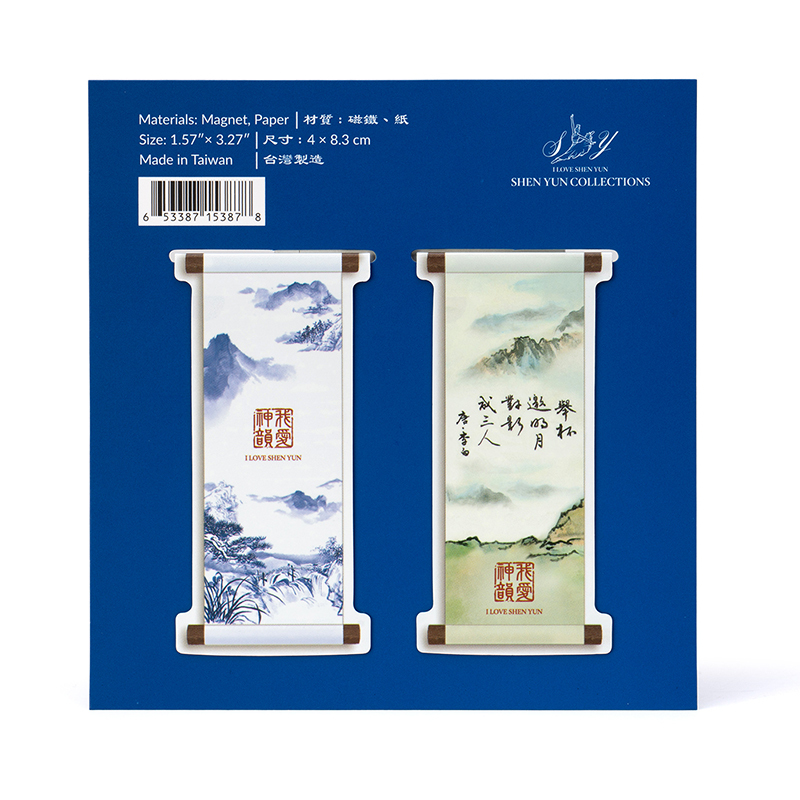 靈感源自神韻歷年以古代著名詩人為主題的舞蹈作品。此書籤組合的兩款設計將經典的山水畫風與優雅的捲軸造型結為一體,以紀念書聖王羲之所作的天下第一行書《蘭亭集序》,以及詩仙李白的名作之一《月下獨酌》中的優美詩句,願其為您美好的閱讀時光增添寧靜致遠的超凡氣息。