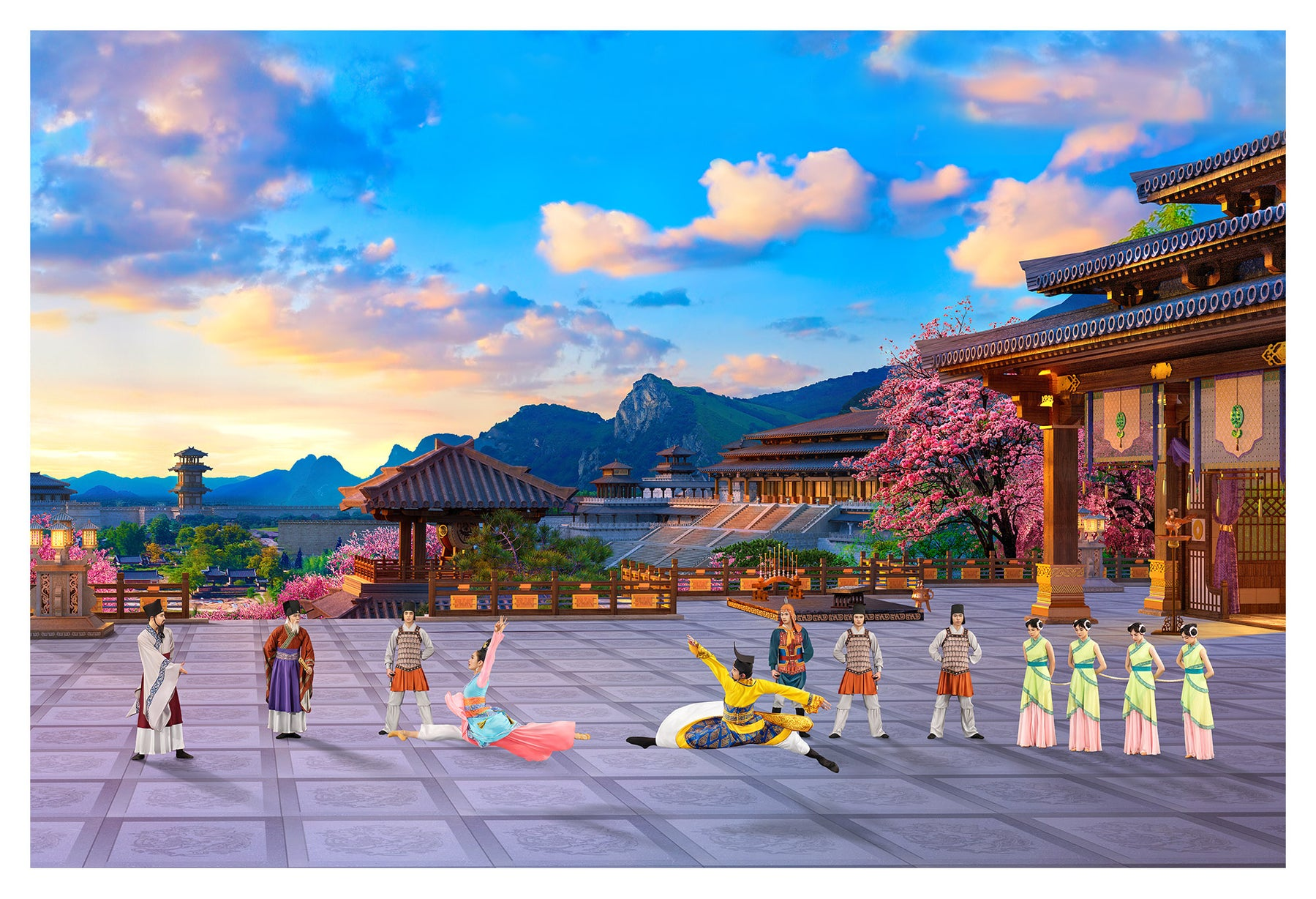 此幅畫作的場景取自神韻舞蹈作品《西施》:春秋末年,吳越爭霸,善良的西施背負家國重托,被越王送入吳宮。館娃宮中的歌舞、姑蘇台上的繁華,當吳王為她身死國滅,西施募然想起十年的恩寵,愧疚之情湧上心頭。